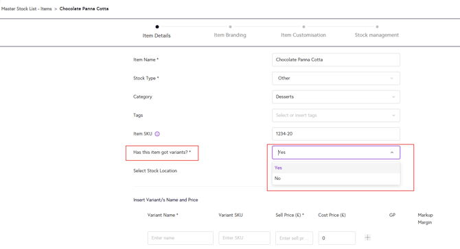 4. For the field ‘Has this item have variants?’, select ‘Yes’ from the dropdown.