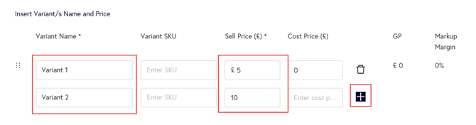 5. Now you will see the fields to add the variant name and selling price (required), as well as SKU and cost price (optional). Once you’ve entered these details, click on the plus (+) icon to add the variant. For deleting the variant you can click on the bin icon.
