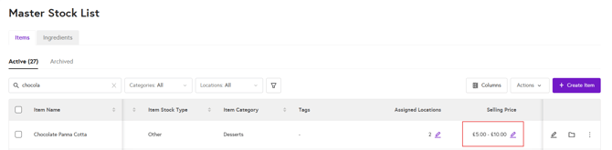 6. After adding your variants and clicking the plus (+) icon, click ‘Next’ and then click ‘Save’ in the final Stock Management section. Your variants will now be added. When you view your item in the Master Stock List, you will see the price range for the variants you’ve created.