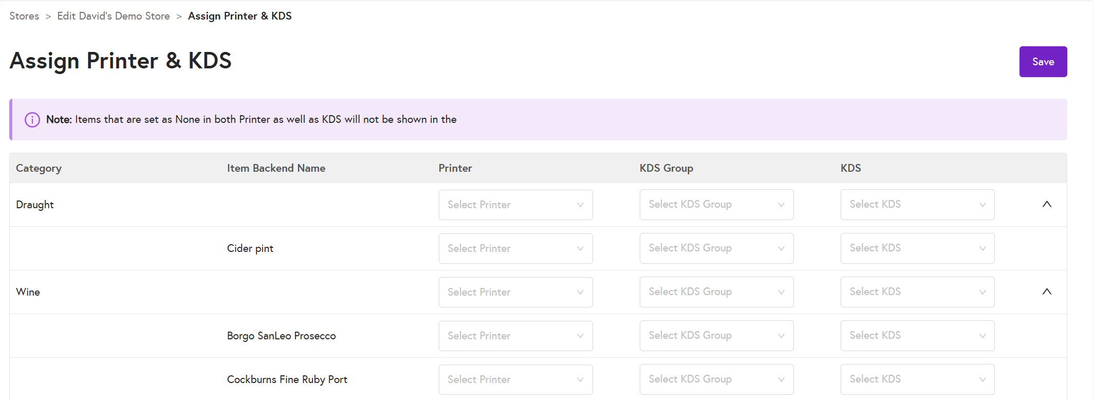 - Example: If Online orders should be sent to a different Printer/KDS than Counter orders, you should configure them individually on the Assign Printer/KDS to Menu Items page.