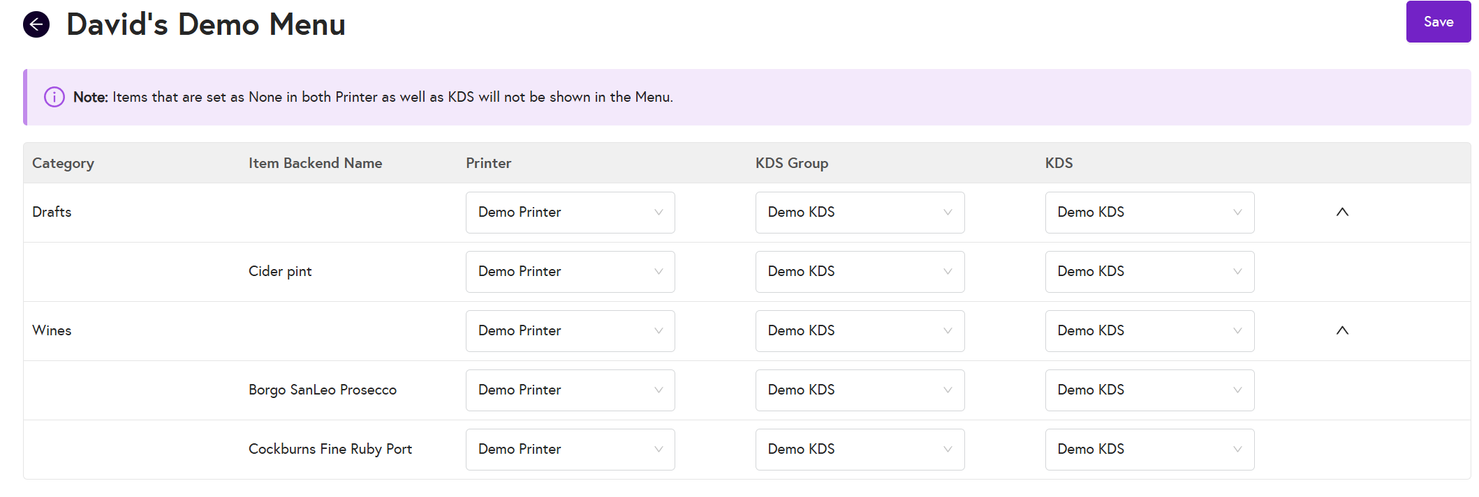 - Important: Each item must be assigned a Printer (or a KDS, if available) for it to appear on the PWA and EPOS Counter menus.