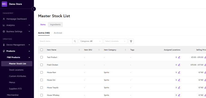 - Navigate to the NOQ Backend Portal > Products > F&B Products > Master Stock List > Items