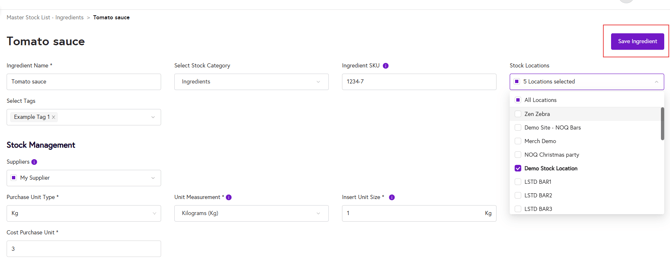 - Select all the applicable Stock Locations for this Ingredient, multi select is allowed. (Optional).