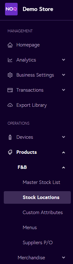 2. Navigate to Products -> F&B -> Stock Location from the left navigation panel.
