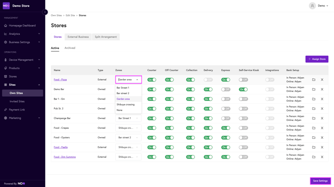 - Use the dropdown list next to each store to assign it to the appropriate zone. Once you've assigned all of your zones and ensured they're assigned to the correct zones, select 'Save Settings'