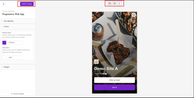 Use the icons shown in the screenshot to preview your web app in different views, such as mobile, tablet, or desktop. Once you’re happy with your branding, click Publish Changes to apply and save your updates.