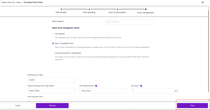 4. Update the Item Details, Item Branding, Item Customisation or Stock Management properties for the selected item as needed.