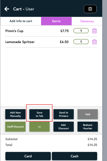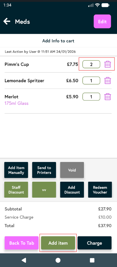 Click on the tab you’ve just created. You’ll see all the items already saved to it. You can delete an item by tapping the bin icon, or adjust the quantity by tapping the number next to the item name. To add more items to this tab, tap Add Items.
