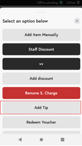 5.From the options available, click on ‘Add Tip’. (S means service)