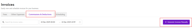 3. From the tabs at the top, click on Commission & Deduction, then select Generate invoices manually on the right side of the screen.