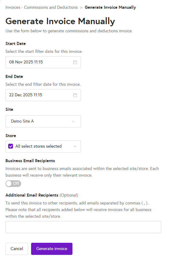 • Business email recipients: toggle this on if you want invoices to be sent to the business email addresses associated with the selected site/store. Each business will receive only its own invoice.