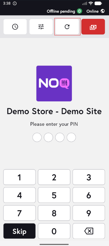 - The second way is to refresh from within the app. After you skip or enter the PIN, tap Actions, then tap the icon in the top-right corner (highlighted in red) to refresh the terminal.
