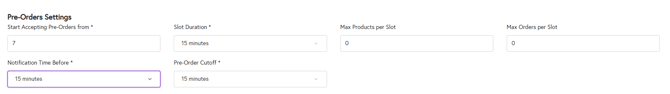 5. Pre-Order Cut-Off Time: Set the cut-off window the same way (15–90 minutes in 15-minute steps).