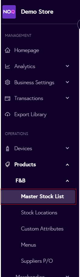 2. From the sidebar, navigate to Products > F&B > Master Stock list. If stock locations is disabled, navigate to Products > F&B > Item List.