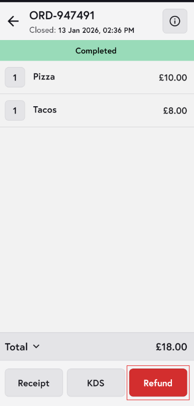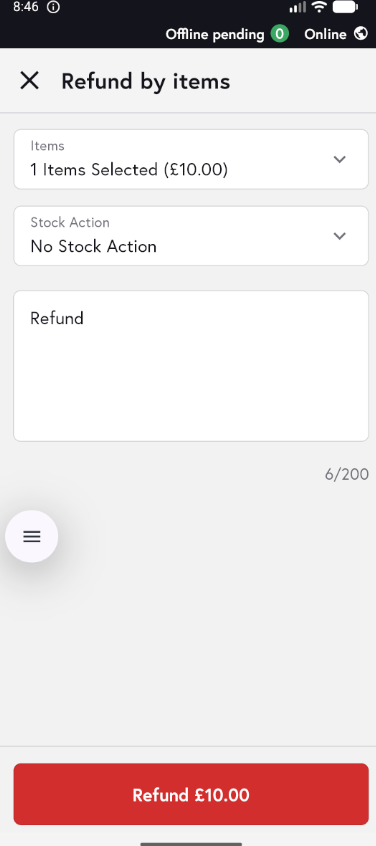 - Add a refund note if required, then tap Refund to proceed.