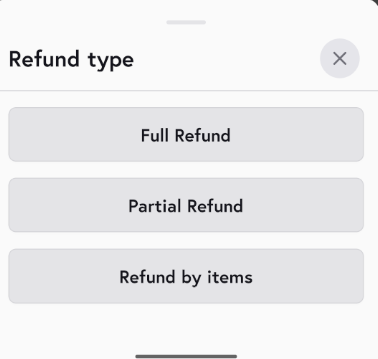 - Partial Refund : Enter the amount you want to refund. The refund amount cannot exceed the total cart amount, otherwise an error will be shown. Add a refund note if required, then tap Refund to proceed.