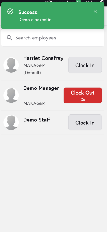 3. You will see a list of all managers and staff. To clock someone in, tap Clock in next to their name.