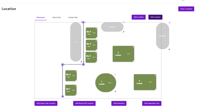 - Add Square/Round Sub Location: Once you have created a location, you can create sub-locations in either a square or round format. Click on your preferred shape sub location button, then enter the sub-location number and capacity, and click Add. The sub-location will appear on the square board, where you can drag and adjust its position as needed.