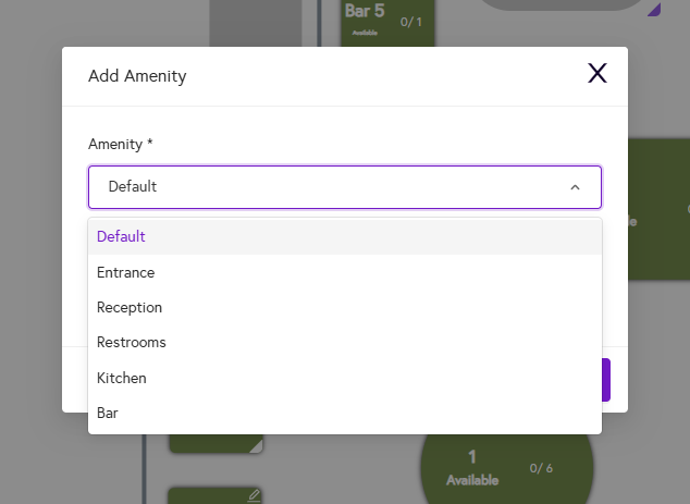 - Amenities: To add amenities to your location, click on Add Amenities. You can either type a custom amenity name by clicking on Default and entering the name, or select an existing amenity from the dropdown and click Add.