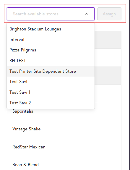 5. From the Select Available Store drop-down, choose the store you want to assign. Once selected, the Assign button will be enabled. Click Assign to link the store to the site.