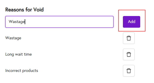 Your reason for void has now been added. To delete it, click the bin icon. To add another reason, repeat the same process as above.