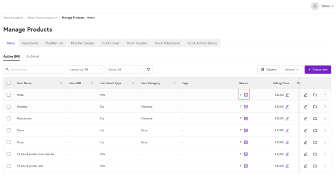 4. You will all items linked to the stock location. Click on the store 🏪icon under the Stores column.