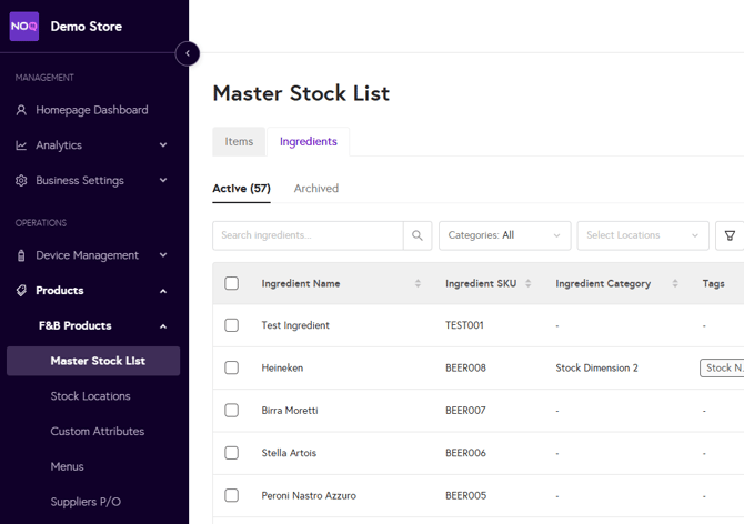 1. Navigate to the NOQ Backend Portal > Products > F&B Products > Master Stock List > Ingredients