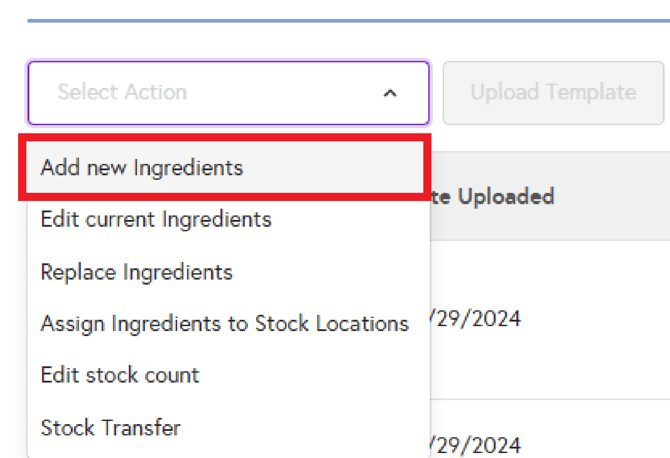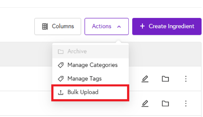 This guide will walk you through the Bulk Upload functionality for uploading ingredients.