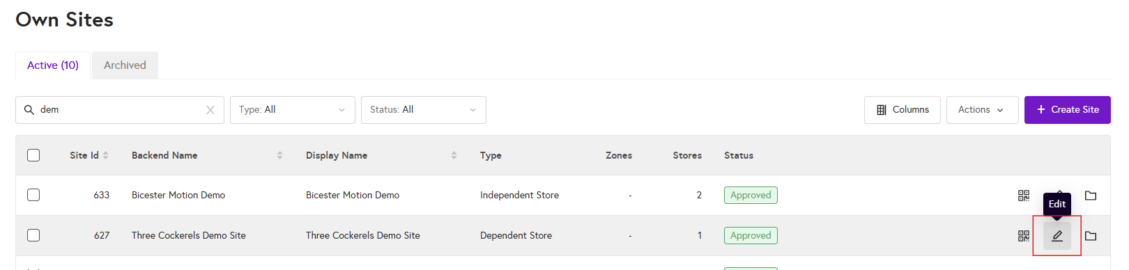 3. Click on the edit icon of the site you would like to check the members list for.