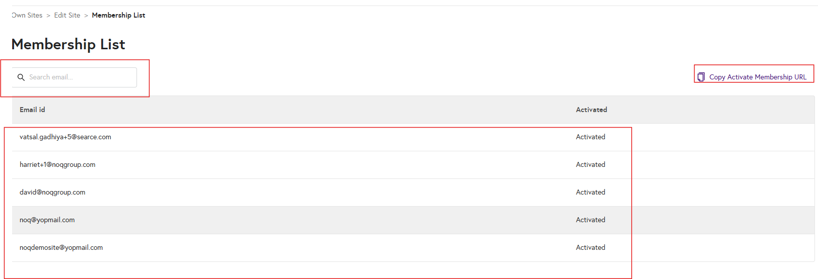 5. On the Members List page, you can view all customers who have registered to receive promotions. You can search by their email address and see the full list here. You can also copy the membership activation URL for your site and share it with customers so they can register.
