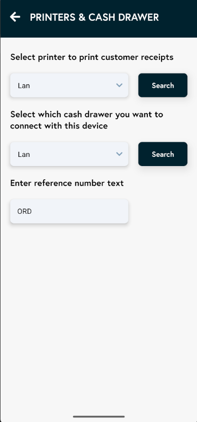 6. You will now see a Search option for printers, and if your cash drawer is connected via LAN, you will also see a Search option for the cash drawer. Tap Search to detect and select the relevant printer and cash drawer.