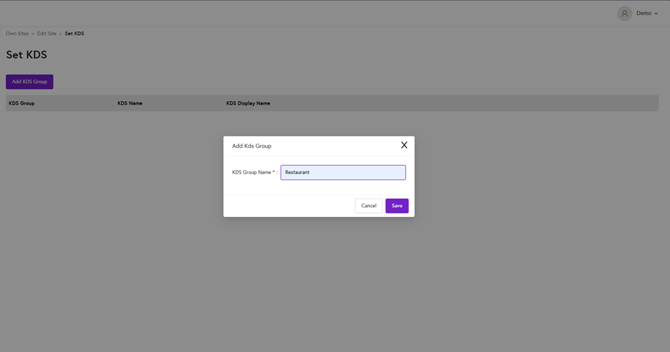 6. Click on plus icon beside the KDS group name to enter KDS name & KDS display name. Click on add to add KDS.