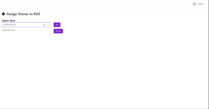 10. Select the store from drop down you want to assign KDS group, the click on add-to-add KDS group to the store. You can also remove store by clicking on remove button.