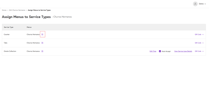 13. After saving store, navigate to Assign Menu, and select the service type, click on pen icon to edit the service type.
