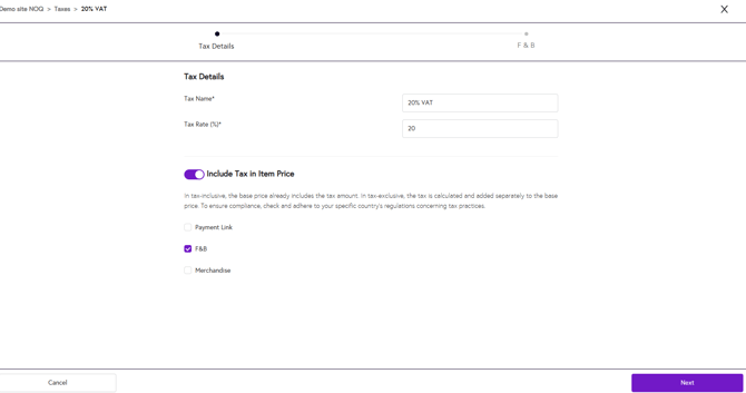 - Lastly, select the checkbox if you want taxes to be enabled for your payment links, F&B, or merchandise, depending on what your business requires.