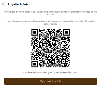 - Clicking on My Current points will show how many points they have collected and a redeemable QR code.