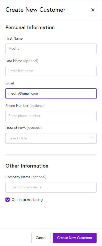 - Once all required details are entered, click on Create Customer to create the new customer record.