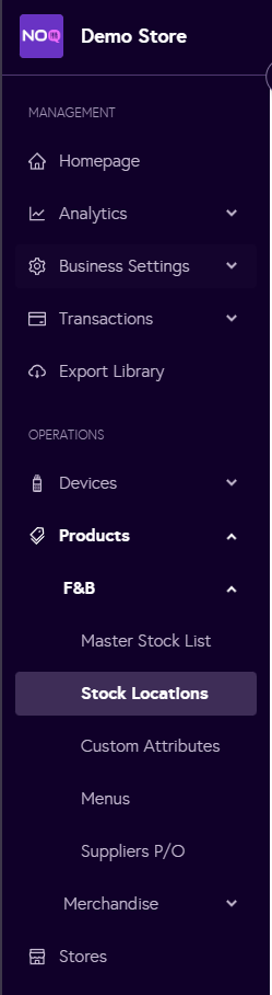 2. From the Sidebar, navigate to Products > F&B > Stock Locations.