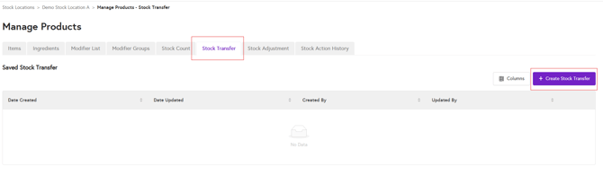 4. Go to Stack Transfer tab, Click on + Create Stock Transfer.