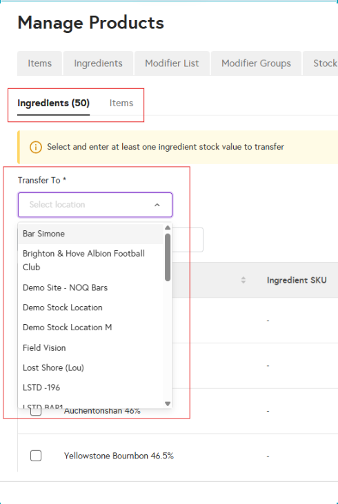 - Here you will see options to transfer ingredients & items. Select the tab of your choosing.