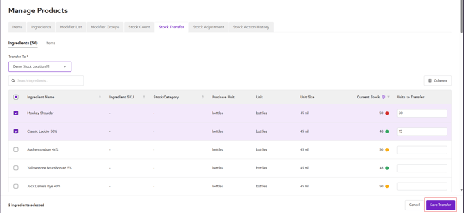 5. Enter the amount of stock you want to transfer under Units to transfer column. It should be less than current stock. After entering the amount, click on Save Transfer.