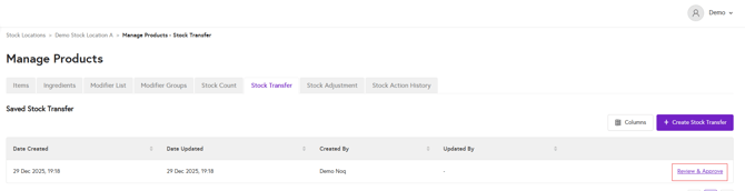 6. After saving you will be redirect to Stock Transfer tab, where you need to approve the stock transfer. To do so, click on Review & Approve.