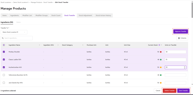 Here, you will see the created stock transfer along with any items that have not yet been transferred. You can create transfers for those items as well. Review the stock transfers before approving. Click Approve Transfer to initiate the transfer, click Save Transfer to save all transfers as a draft, or click Delete Transfer to remove the transfer.