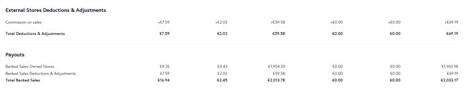 - Under the Sales Summary tab, there is a External Stores Deduction & Adjustment. This shows total commission & adjustment fees you have received from any external businesses.