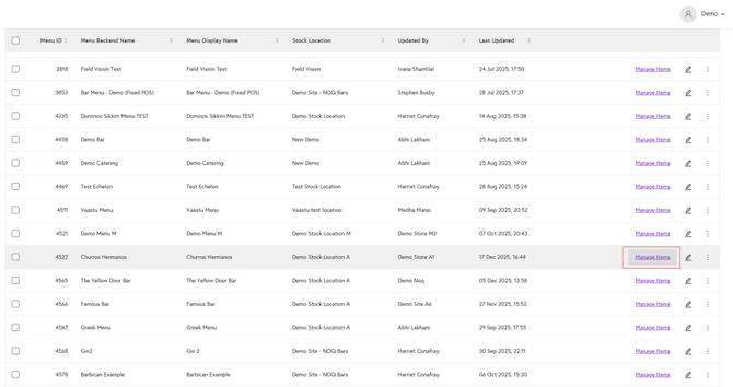 3. Click on Manger Items on the menu you want to edit.