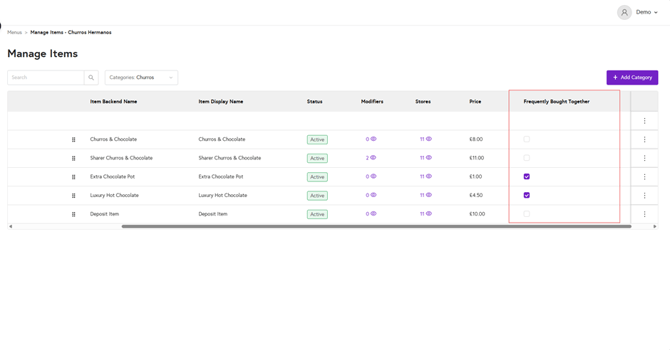 4. Here you will see all the categories and menu items you created. If you scroll right you will see a column name frequently bought together.
