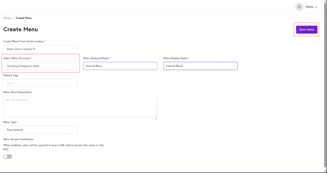 3. If stock location is enabled, use the Create Menu From Stock Location drop-down to select the relevant stock location. From the Menu Structure drop-down, select Grouping-Categories-Items. Enter the menu backend name and display name, then click Save menu to create the new menu.