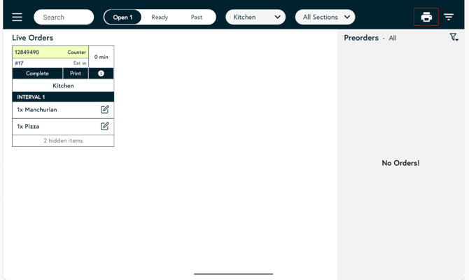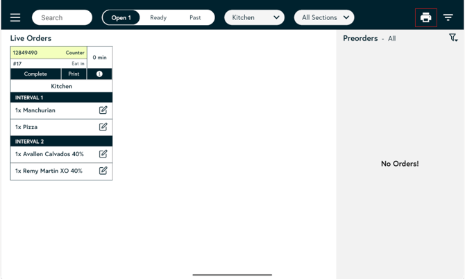 Click the printer icon in the top-right corner to print only the currently selected group’s open ticket.