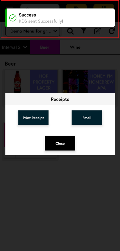 After selecting another group, add the required items from that group as well. Once all items from the necessary groups have been added to the basket, proceed to take payment as normal. A confirmation message will appear stating that “KDS sent successfully.”