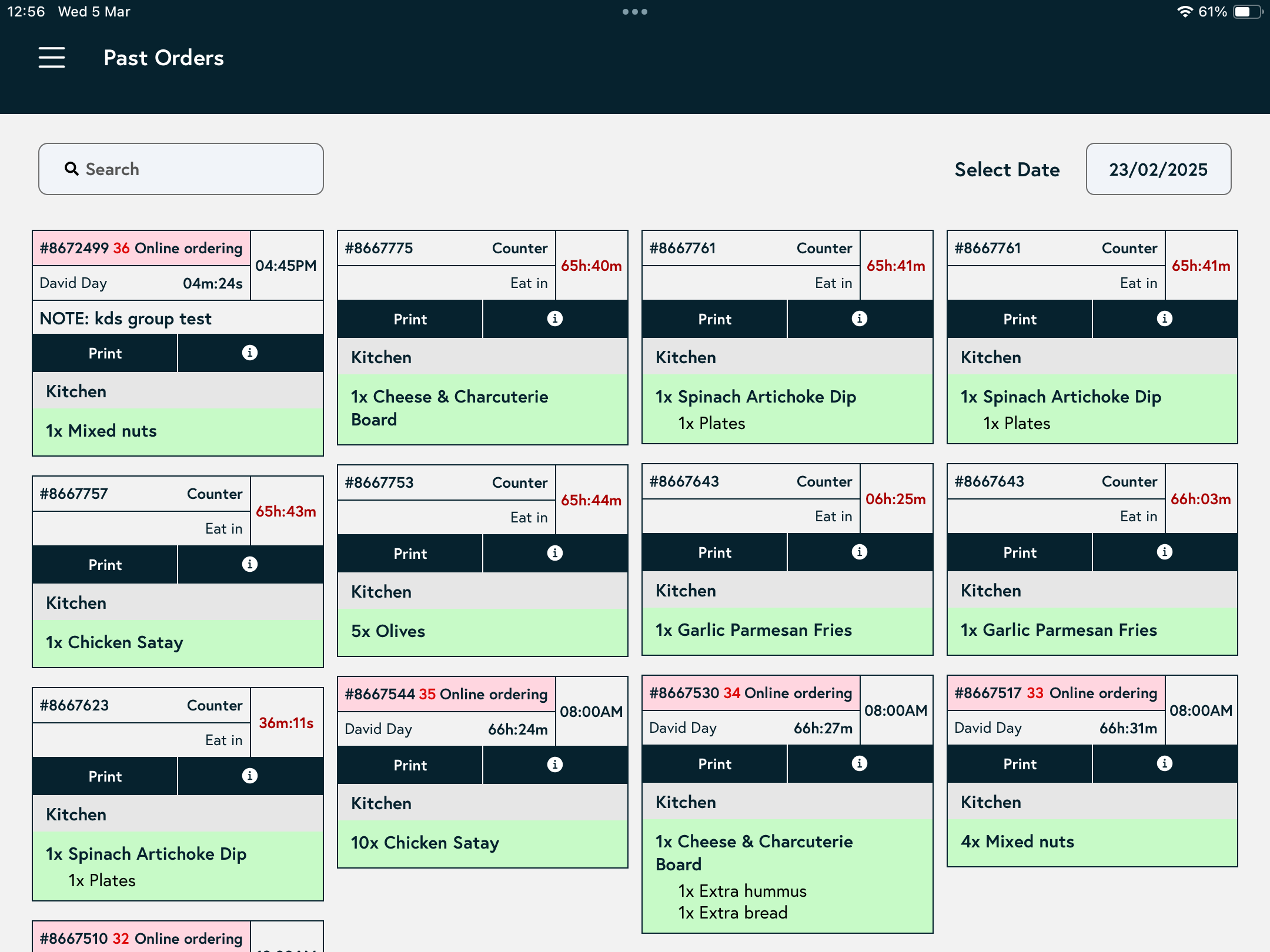 - All completed orders from the selected date will display, showing: